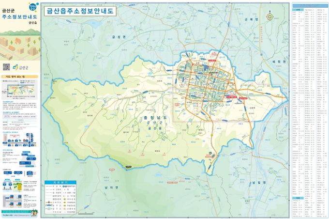 군은 금산군 전역의 도로명주소와 주요 건물, 주소정보시설 현황을 반영해 지도를 제작했으며 각 읍·면별 주소정보 기본도와 관광안내도를 함께 수록해 주소 확인과 관광 정보 제공을 동시에 할 수 있도록 구성했다.