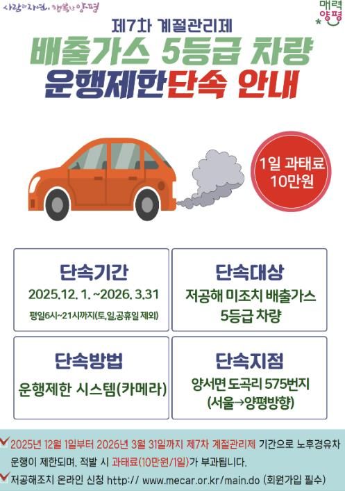 (중부시사신문) 양평군(은 오는 12월 1일부터 2026년 3월 31일까지 제7차 미세먼지 계절 관리제 시행에 따라 배출가스 5등급 차량에 대한 운행 제한 단속을 시행한다고 밝혔다.