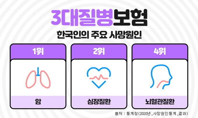 (중부시사신문) 한국인의 주요 사망원인중에 암, 뇌혈관질환, 심혈관질환은 흔히 3대질병이라 일컬어지며 살아가면서 가장 먼저 대비해야 하는 중대질병으로 항상 강조되고 있다. 이들 질병에 미리 대비하기 위해 가입하는 것이 진단비보험인데, 이러한 3대질병진단비를 중점으로 보장하는 보장성보험이 3대진단비보험 이다. 3대질병진단비보험은 각각의 질병에 주목해서 보장하기도 하지만, 나에게 맞는 추가 특약을 잘 골라서 가입한다면 종합건강보험으로도 충분히 활용도가 높다.