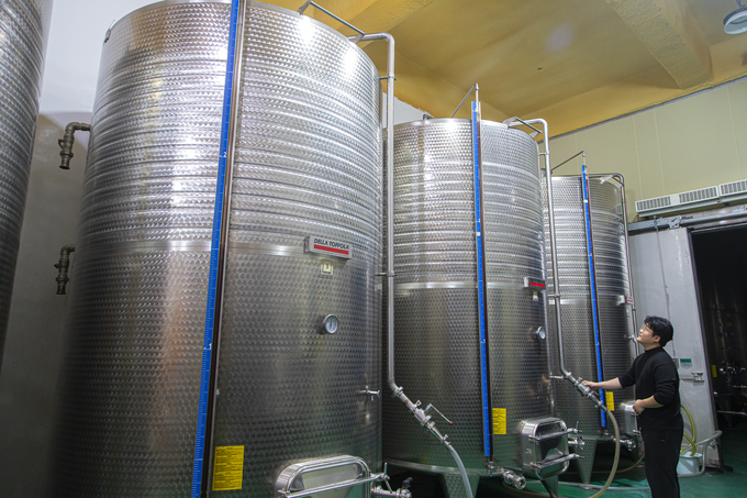 산머루농원의 저장고에 들어서면 탄성이 절로 나온다. 유럽의 오래된 와이너리에서 보던 풍경이 눈앞에 펼쳐지는것 같아서다. 저장고에는 3단 높이로 쌓아놓은 오크통이 가득하다. 저마다 이름표처럼 용량과 날짜가 적혀 있어 묵직한 시간이 켜켜이 쌓인 느낌을 준다. 와이너리 체험은 이 저장고는 물론이고 실제 생산 시설까지 함께 둘러볼 수 있어 머루가 와인으로 변하는 과정을 자연스럽게 이해하게 된다.
