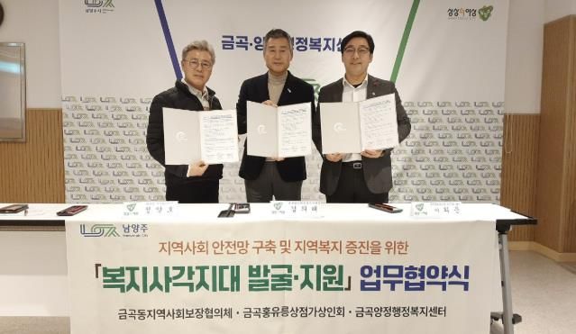 (중부시사신문) 남양주시는 15일 금곡양정행정복지센터가 금곡동 지역사회보장협의체 및 금곡홍유릉상점가상인회와 함께 복지사각지대 발굴 및 취약계층 지원 강화를 위한 업무협약(MOU)을 체결했다고 밝혔다.