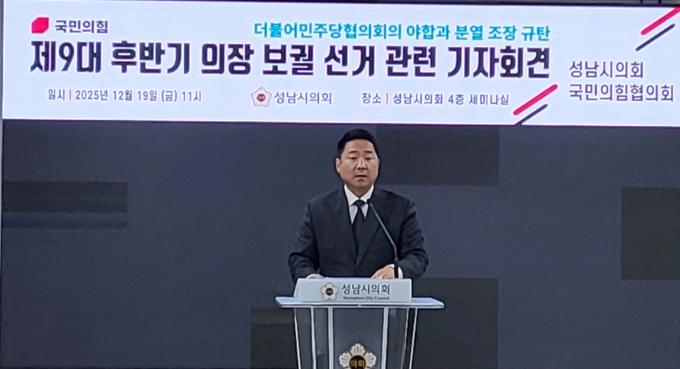 성남시의회 국민의힘협의회(정용한 대표의원)는 19일 오전 11시 성남시의회 4층 세미나실에서 기자회견을 열어 18일 제307회 성남시의회 제2차 정례회 제3차 본회의에서 진행된 후반기 의장 보궐선거에서 보여 준 더불어민주당협의회 소속 의원들과 국민의힘협의회 소속 박은미 의원 등의 야합을 규탄하며 즉시 관련 의원에 대한 경기도당 징계 요구를 시사했다.