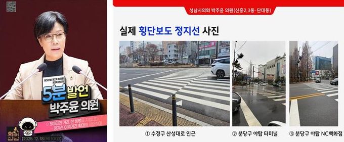 (중부시사신문) 성남시의회 박주윤 의원(국민의힘, 신흥2·3동·단대동)은 12월 18일 열린 제307회 성남시의회 제3차 본회의 5분 발언에서 보행자의 생명과 직결된 ‘횡단보도 정지선 이격거리 확대 설치’의 시급성을 강조하며, 성남시의 적극적인 개선책 마련을 촉구했다.