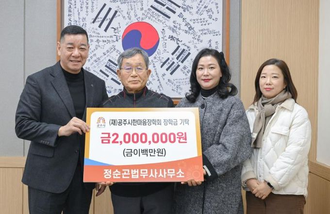(중부시사신문) 정순곤법무사사무소는 지난 6일 (재)공주시한마음장학회에 가정형편이 어려운 학생들을 위한 장학금 200만 원을 기탁했다.