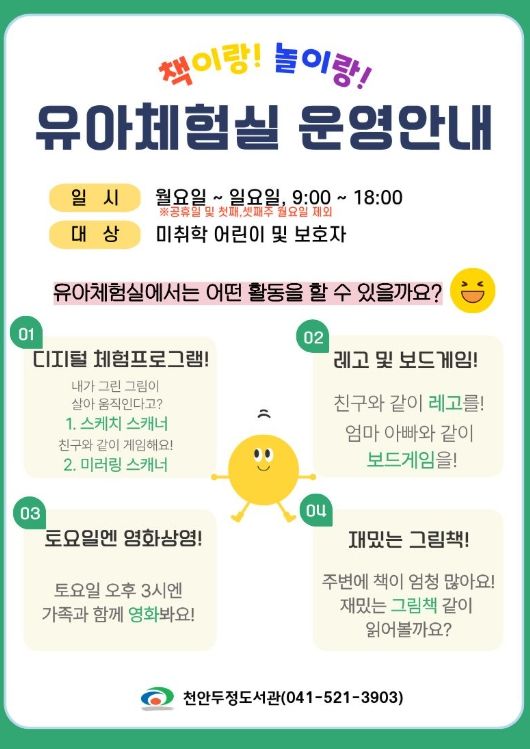 (중부시사신문) 천안시 두정도서관은 미취학 아동을 위한 ‘놀이 기반 독서 환경’인 유아체험실을 운영해 주민들로부터 호응을 얻고 있다고 12일 밝혔다.