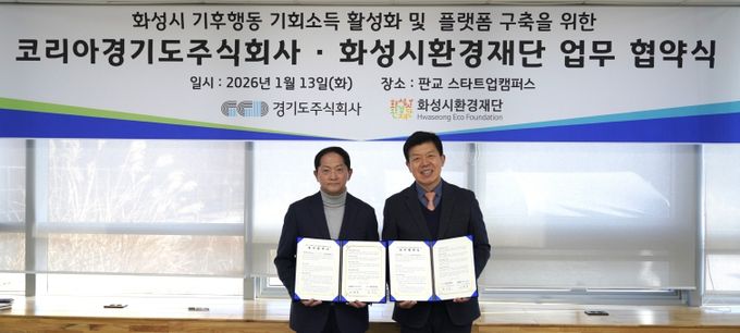 (중부시사신문) 경기도주식회사는 13일 경기도 성남시 판교 스타트업캠퍼스에서 화성시환경재단과 ‘기후행동 기회소득 활성화 및 화성시 플랫폼 구축을 위한 업무협약’을 체결했다.