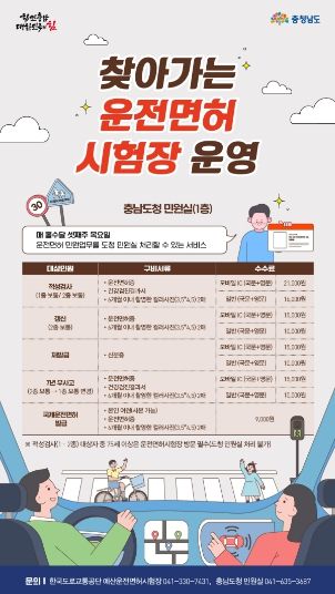 찾아가는 운전면허시험장은 도로교통공단 예산운전면허시험장과 협력해 운전면허 관련 민원 업무를 도청 민원실에서 직접 처리하는 서비스이다.