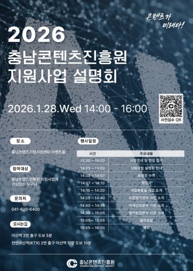 (중부시사신문) (재)충남콘텐츠진흥원(원장 김곡미)은 오는 1월 28일 오후 2시, 충남콘텐츠기업지원센터 이벤트홀에서 ‘2026년 지원사업 설명회’를 개최한다고 밝혔다.
