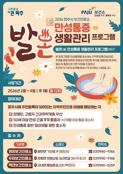 (중부시사신문) 파주시 보건진료소는 보건의료 취약지역 주민들의 건강증진을 위해 2026년 ‘발온(溫) 만성통증 생활관리’교실을 운영한다.