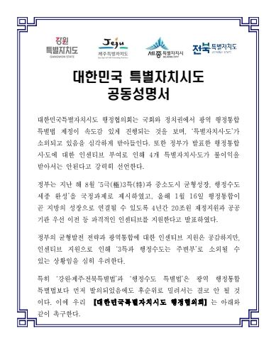 세종특별자치시와 제주특별자치도, 강원·전북특별자치도로 구성된 ‘대한민국특별자치시도 행정협의회’는 22일 이같은 내용을 담은 4개 시도지사 명의의 공동성명서를 발표했다.