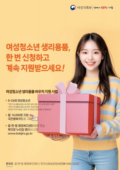 본 사업은 만 9세부터 24세까지의 여성 청소년 중 기초생활수급자, 차상위계층, 한부모가족 요건에 해당하는 여성 청소년에게 지원되며, 신청자에게는 월 14,000원 상당의 생리용품 구매 바우처가 제공된다.