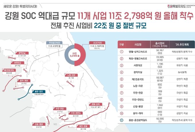 (중부시사신문) 강원특별자치도는 현재 추진 중인 SOC 교통망 사업 22조 원 가운데 절반이 넘는 11조 원 규모의 사업을 올해 본격 착수한다고 밝혔다.