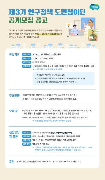 (중부시사신문) 경기도가 정책 대상자가 직접 정책개선에 참여하는 ‘제3기 인구정책 도민참여단’ 100명을 공개 모집한다.