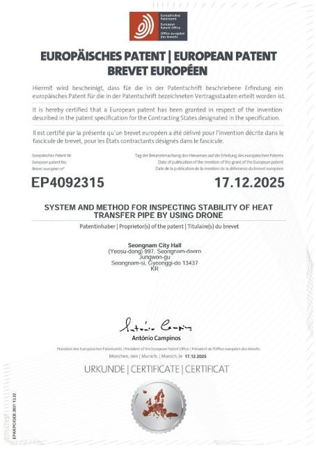 (중부시사신문) 성남시가 자체 개발한 ‘드론을 이용한 열수송관 안정성 검사 시스템’이 유럽특허(등록번호 EP4092315) 등록을 완료했다고 밝혔다. 이는 시 최초의 해외특허 등록 사례로, 지식재산의 해외 권리화를 통해 유럽 수출길을 여는 계기가 될 것으로 기대된다.