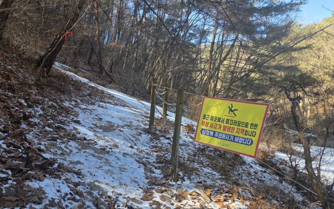 군은 십이폭포 중 운옥폭포(제9폭포)에 미끄럼 주의 현수막을 설치했다.