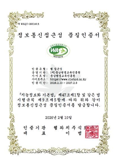 (중부시사신문) 충남평생교육진흥원은 과학기술정보통신부 지정 국가공인 인증기관(㈜웹와치)으로부터 정보통신접근성 품질인증을 획득했다고 밝혔다.