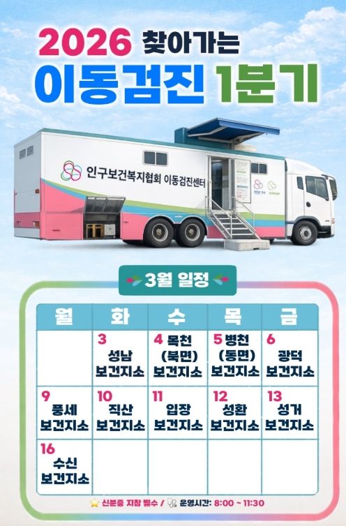 이현기 서북구보건소장은 “읍면 주민들이 가까운 곳에서 편리하게 건강 상태를 확인할 수 있도록 마련한 사업”이라며 “다양한 검사를 한 번에 받을 수 있는 만큼 적극적인 참여를 바란다”고 말했다.