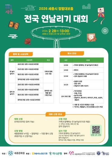 세종특별자치시는 세종문화원 주관으로 ‘2026년 세종시 정월대보름 전국 연날리기 대회’ 참여자를 모집한다고 밝혔다.
