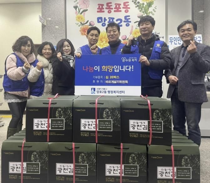 (중부시사신문) 영통구 망포2동 행정복지센터는 지난 6일 망포2동 바르게살기위원회가 관내 저소득 가정을 지원하기 위해 김 20박스를 기탁했다고 밝혔다.