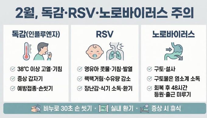 노로바이러스는 구토·설사를 유발하는 전염력 강한 감염증으로, 손·음식·오염된 환경을 통해 퍼질 수 있다. 치료약은 없으며 탈수 예방을 위한 수분 섭취가 가장 중요하다. 화장실 사용 후 손 씻기, 음식 충분히 익혀 먹기, 구토물 오염 부위는 장갑·마스크 착용 후 염소계 소독제로 소독하고, 가능하면 회복 후 48시간은 등원·등교·출근을 미루는 것이 권장된다.