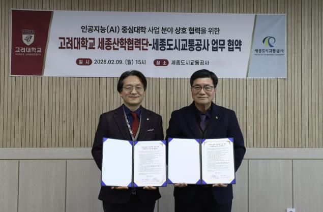(중부시사신문) 세종도시교통공사는 2월 9일, 공사 사장실에서 고려대학교 세종산학협력단과 ‘인공지능(AI) 중심대학 사업 협력 및 공사 사업 AX(AI 전환) 가속화를 위한 업무협약(MOU)’을 체결했다고 밝혔다.