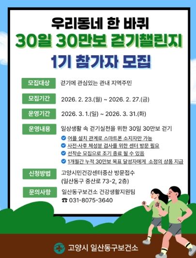 (중부시사신문) 고양특례시 일산동구보건소는 지역 주민의 기초 체력 증진과 신체활동 활성화를 위해 기획한‘우리동네 한 바퀴 30일 30만보 걷기 챌린지’1기 참가자를 오는 23일부터 모집한다.