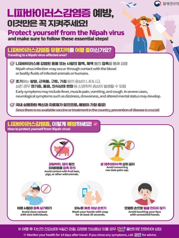 니파바이러스감염증 예방 수칙은 △ 박쥐, 돼지 등 (야생)동물 접촉 피하기 △ 발생 지역 생 대추야자수액 및 오염된 음료 식품 섭취 금지 △ 환자와 접촉 금지 △ 자주 손 씻기 등 개인위생 철저 △ 오염된 손으로 얼굴 만지지 않기 △ 의료기관 필요시에만 방문하고, 방문 시 마스크 착용 등 예방 수칙 준수