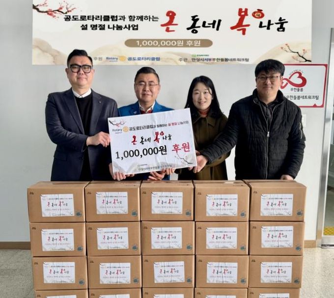 (중부시사신문) 사회복지법인 한길복지재단이 수탁 운영하는 안성시서부무한돌봄네트워크팀은 국제로타리 3600지구 공도로타리클럽과 지난 12일 설 명절 나눔사업 ‘온동네 복나눔’ 후원금 100만 원 전달식을 가졌다.
