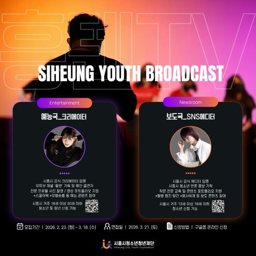(중부시사신문) 시흥시청소년청년재단은 시흥시 청소년ㆍ청년의 미디어 활동 역량을 강화하고, 재단의 소통 기능을 확대하기 위해 ‘흥텐TV’를 운영하는 가운데, ‘흥텐TV’를 함께 이끌어갈 예능국·보도국 신규 단원을 3월 18일까지 모집한다.