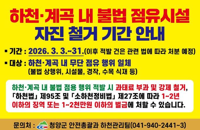 군 관계자는 “하천과 국·공유지는 특정 개인의 소유가 아닌 군민 모두의 소중한 공동 자산”이라며 “무단 점용과 불법 경작은 재해 위험을 높여 우리 이웃의 생명과 재산을 위협할 수 있는 만큼 자진 철거에 적극 협조해 주시길 바란다”고 당부했다.