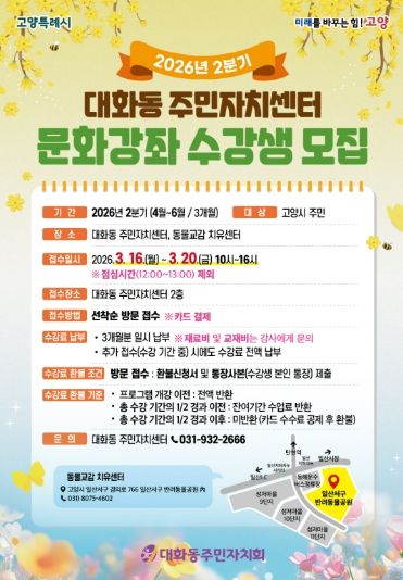 (중부시사신문) 고양특례시 일산서구 대화동 주민자치회는 주민들의 문화적 욕구를 충족하고 삶의 질을 높이기 위해 오는 3월 16일부터 20일까지 ‘2026년 2분기 문화강좌’ 수강생을 모집한다.