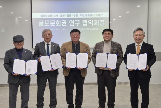(중부시사신문) 부천문화원과 강서문화원, 계양문화원, 김포문화원, 부평문화원은 3월 4일 부천문화원에서 ‘굴포문화권’을 토대로 하는 연구교류 협약식을 체결했다. 이로써 ‘굴포’를 같은 문화권으로 하는 부천문화원·강서문화원·계양문화원·김포문화원·부평문화원은 학술대회와 콘텐츠 발굴 사업 등 다양한 지역학 자원을 발굴하고 활성화하기 위해 최초로 지역학 연구 모델을 구축하게 됐다. 특히, 이번 협약은 경기도(부천, 김포), 서울특별시(강서), 인천광역시(계양, 부평)를 잇는 ‘지역학’ 중심의 연구 교류를 마련한다는 점에서 주목된다.