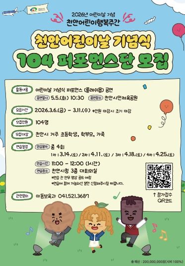 한편, 시는 5월 1일부터 5일간 ‘2026 천안 어린이 행복주간’을 운영한다. ‘오늘의 놀이가, 내일의 꿈으로’를 주제로 △쿠킹클래스 △미술대회 △천안시티FC 축구교실 △어린이 영화제 등 다채로운 프로그램을 진행할 계획이다.