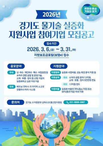 (중부시사신문) 경기도가 ‘2026년 경기도 물기술 실증화 지원사업’ 참여 기업을 공개 모집한다.