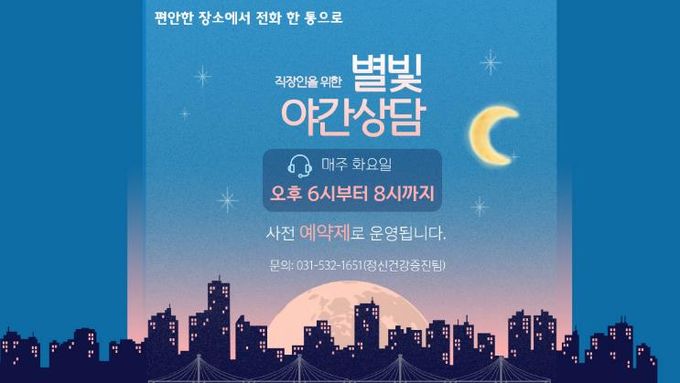 (중부시사신문) 포천시정신건강복지센터는 직장인, 학생, 취업 준비생 등 낮 시간 상담 이용이 어려운 시민들이 보다 편리하게 마음건강 상담을 받을 수 있도록 ‘야간 마음건강 상담서비스(별빛 야간 상담)’를 운영한다.
