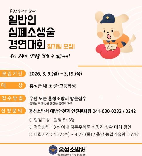 (중부시사신문) 홍성소방서는 심정지 환자 발생 시 신속한 응급처치로 생명을 보호하고 군민의 심폐소생술(CPR) 역량을 높이기 위해 ‘2026년 일반인 심폐소생술 경연대회’ 참가팀을 모집한다고 11일 밝혔다.