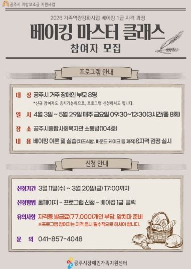 (중부시사신문) 공주시장애인가족지원센터(센터장 이영식)는 오는 3월 20일까지 장애인 부모를 대상으로 베이킹 1급 자격 과정인 ‘베이킹 마스터 클래스’ 참여자를 모집한다고 밝혔다.