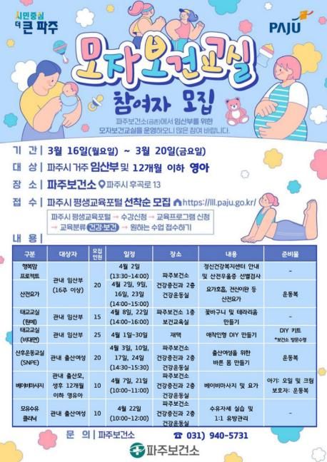 (중부시사신문) 파주보건소는 건강한 임신과 출산, 행복한 육아를 지원하기 위해 4월부터 운영하는 ‘모자보건 프로그램’참여자를 모집한다.