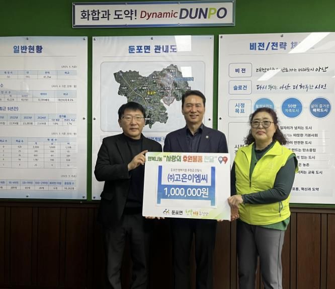 (중부시사신문) ㈜고은이엠씨는 지난 17일 아산시 둔포면 행복키움추진단을 찾아 어려운 이웃을 위한 후원금 100만 원을 전달했다.