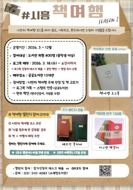 (중부시사신문) 시흥시도서관은 시민의 독서 실천을 지원하고 일상 속 독서문화를 확산하기 위해 3월 18일부터 ‘2026 시흥 책여행(시즌2)’ 로그북을 배부하고, ‘책여행 로그북 챌린지’를 함께 운영한다.