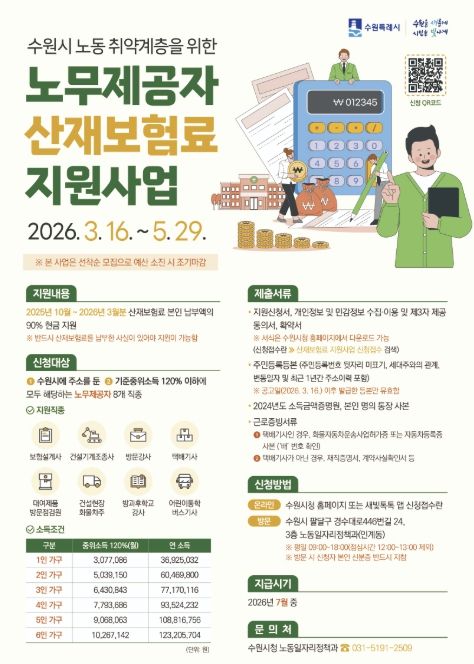 (중부시사신문) 수원특례시는 5월 29일까지 ‘2026년 상반기 노동 취약계층 노무제공자 산재보험료 지원사업’ 신청을 받는다.