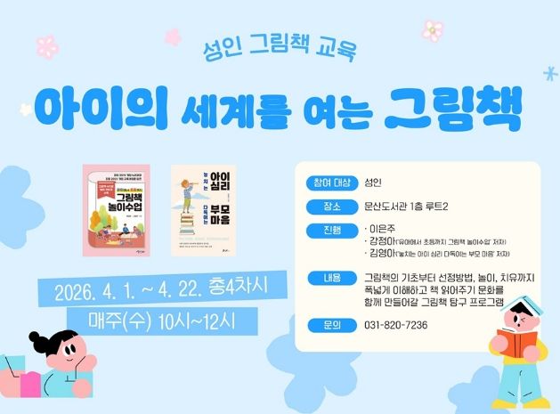 (중부시사신문) 파주시 문산도서관은 그림책의 가치와 활용 방법을 이해하고, 지역사회에 책 읽어주기 문화를 확산하기 위한 그림책 교육 프로그램 ‘아이의 세계를 여는 그림책’을 오는 4월 1일부터 4월 22일까지 운영한다.