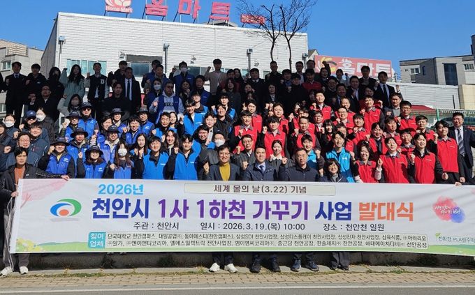 (중부시사신문) 천안시는 세계 물의 날(3월 22일)을 기념해 19일 천안천 일원에서 ‘2026년 1사 1하천 가꾸기 사업’ 발대식을 개최하고 하천 정화활동을 진행했다.