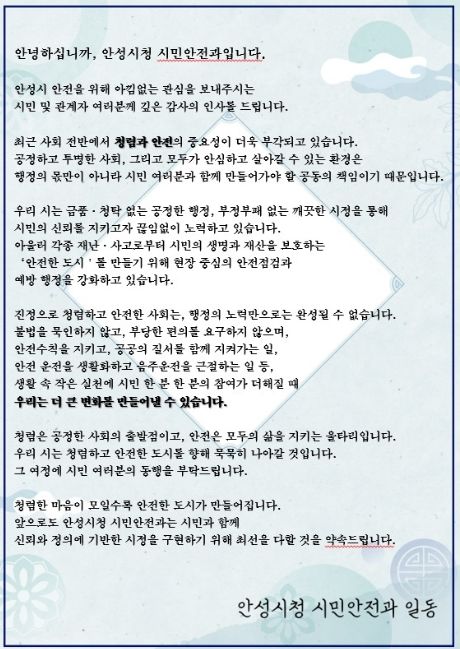 (중부시사신문) 안성시는 각종 안전점검 과정에서 청렴 안내문을 배부하는 ‘청렴한 안전점검’을 추진하며 시민 청렴의식 제고에 나선다.
