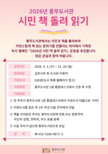 (중부시사신문) 김포시 풍무도서관은 오는 4월부터 ‘2026년 시민 책 돌려 읽기’ 독서 릴레이를 운영한다.