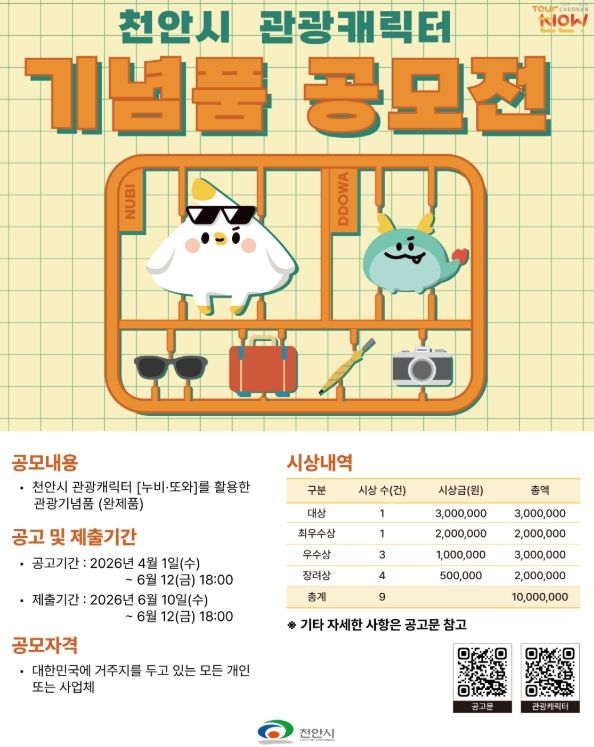(중부시사신문) 천안시가 지역 관광 캐릭터인 ‘누비·또와’를 활용해 천안의 관광 자원을 알리고 지역 브랜드 경쟁력을 강화하기 위한 기념품 공모전을 개최한다.