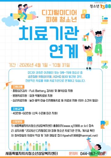 (중부시사신문) 세종특별자치시청소년상담복지센터는 지역사회 내 미디어 과의존 어려움을 겪고 있는 청소년들의 건강한 성장을 돕기 위해 4월부터 10월까지 미디어 과의존 청소년을 대상으로 치료기관(병원 등) 연계 서비스를 지원한다.