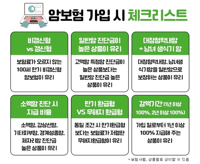 우선, 암보험을 가입하기 위해서는 갱신형 상품과 비갱신형 상품중에서 선택을 해야 한다. 갱신형은 처음 가입 시에는 보험료가 상대적으로 저렴하지만 갱신을 이어가면서 보험료가 계속 인상될 수 있고, 비갱신형은 초기 보험료는 갱신형보다 높을 수 있지만, 가입 후에 보험료인상이 없어 안정적으로 유지관리가 가능한 장점이 있다. 따라서 이러한 장단점을 고려하여 본인의 상황에 맞게 선택하는 것이 좋다.