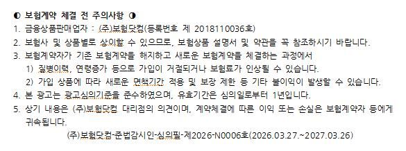 보다 자세한 가입 조건이나 적정 진단금액 설정은 비갱신형 암보험 비교사이트를 활용하여 여러 회사의 상품을 실시간으로 보험료 비교도 해볼 수 있으며, 다양한 정보를 비대면으로 주말까지 전문가와 상담이 가능하므로 3대진단비 등 종합건강보험 가입 시 편리하게 이용할 수 있다.