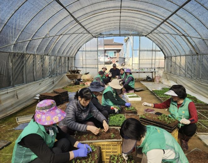 이번 작업에는 신평면 새마을지도자와 각 마을 부녀회장 등 총 42명이 참여해, 그동안 노지에 파종해 정성껏 길러온 꽃씨를 모종 포트로 옮겨 심는 작업을 함께 진행했다.